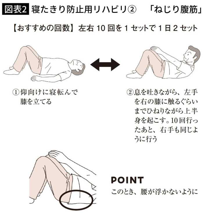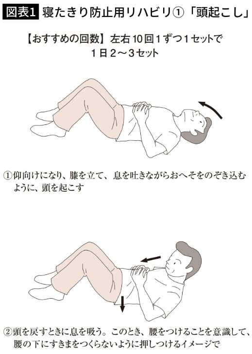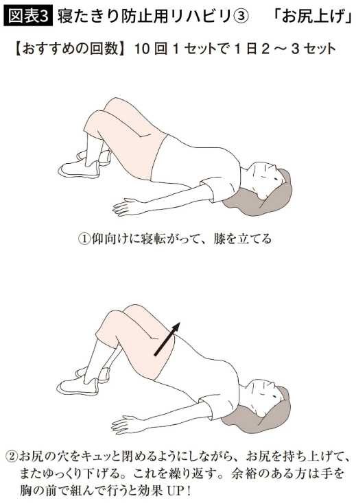 家で1人でもできる寝たきり予防に役立つリハビリを3つ紹介します。ベッドから起き上がるとき、寝返りをうつように、体を横に向けて、そこから頭を起こして、起き上がります。ですので、首、背中、お腹、そして、お尻の筋肉の衰えを予防することが大切です。具体的には図表1、2、3の3つです。