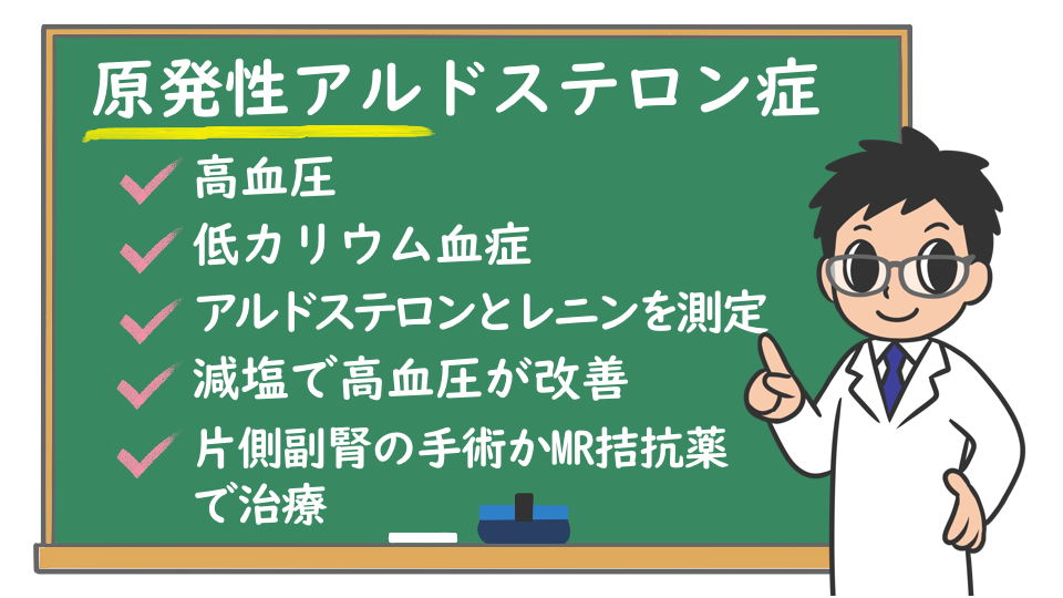 原発性アルドステロン症は、副腎からアルドステロンというホルモンが過剰に分泌される疾患だ。アルドステロンは、血中のナトリウムとカリウムのバランスを調整する働きを担っている。アルドステロンの値が高過ぎると体内のカリウムが失われてナトリウムが保持されやすくなり、それによって血圧が上昇する。