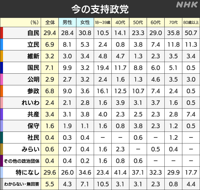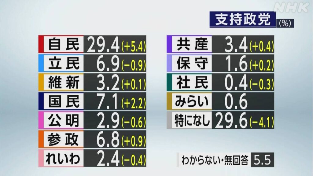 8月の各党の支持率 情報通信・ネット・メディア 2025.08.15 政党支持率 自民29.4% 国民7.1% 立民6.9% 参政6.8% 以下は、記事の抜粋です。 8月の各党の支持率です(括弧内は7月の支持率)。 うーん。