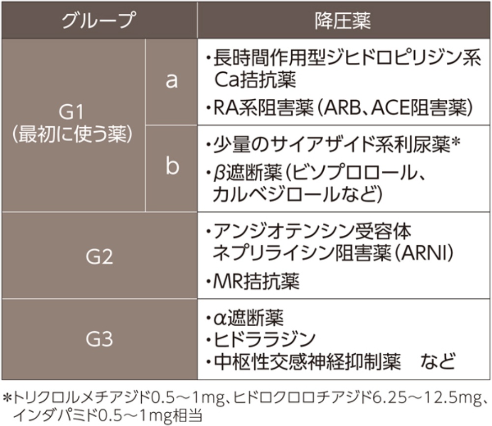 G1降圧薬の単剤投与でも効果不十分であれば2剤併用やG2降圧薬(ARNI、MR拮抗薬)の処方を検討する。さらに降圧目標を達成できない場合にはG1・G2降圧薬から3剤併用を行う必要がある。ただし、それでも効果がみられない場合には、専門医への紹介が考慮される。