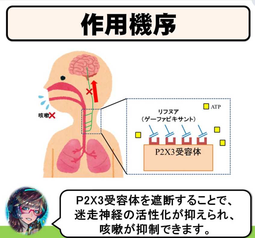 不勉強のため、ぜんぜん知りませんでした。あくまで対症療法ですが、慢性咳嗽の原因となる疾患の診断と適切な治療を十分に行っても改善しない「難治性の慢性咳嗽」の場合に考慮します。
