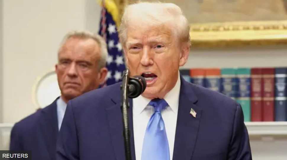 妊婦が鎮痛剤タイレノールを使うと子供の自閉症につながるという科学的に立証されていない説を主張するトランプ大統領。後ろにはそうした主張をかねて繰り返していたケネディ厚生長官