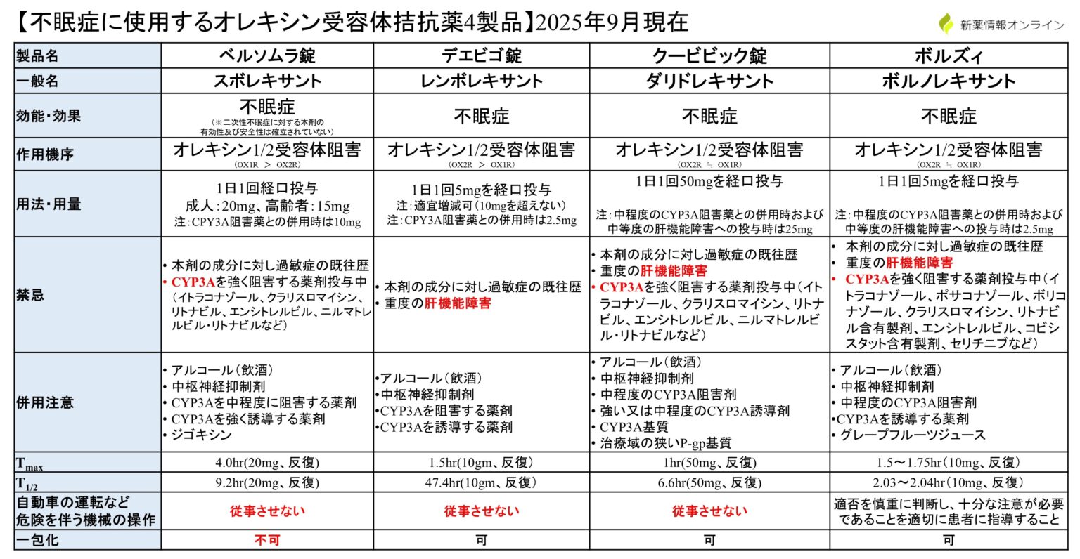 「ボルノレキサント水和物(商品名:ボルズィ錠2.5mg/5mg/10mg)」は、オレキシン受容体に選択的に作用する不眠症治療薬であり、消失半減期が短いことから翌日への持ち越し効果の懸念が少ないことが期待されています。