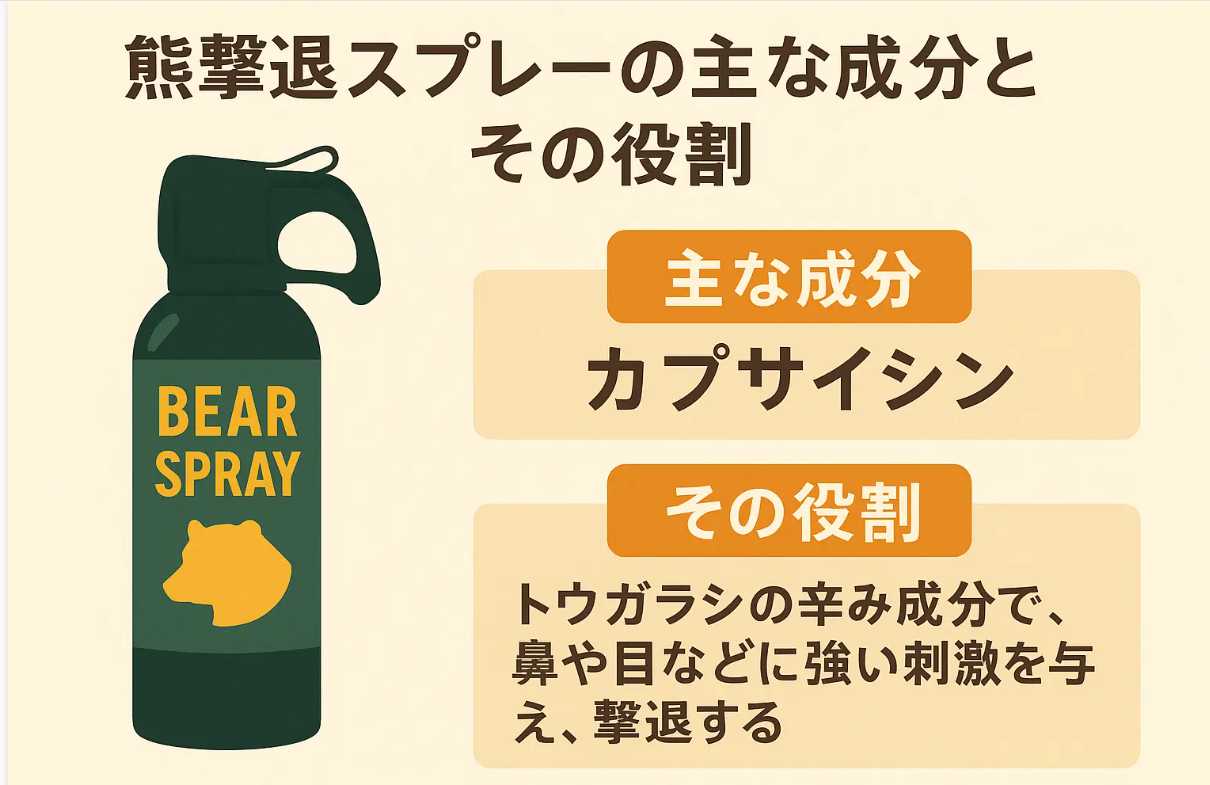 「忌避剤」という言葉が誤解を生むと思います。「クマスプレーで霧状に噴射されたカプサイシンは、目や鼻、のどの粘膜、皮膚に付着して感覚神経に作用し、強烈な痛みを感じさせてクマを追い払う。」ことを理解して使いましょう。もちろん、ヒトに向かって使わないようにしましょう(記事をみる)。