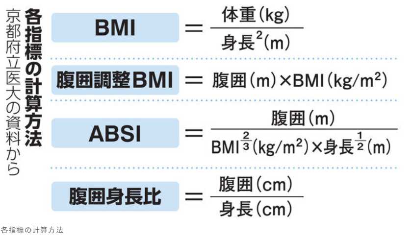 体の丸み指数(body roundness index)の計算式は、BRI = 364.2 – 365.5 × √{1 – (腹囲 / (2π))² / (0.5 × 身長)²} と非常に複雑です。この式は、身長、腹囲、そしてBMIのように体組成全体を楕円で近似し、そこから算出される離心率(体の丸みを示す指標)に基づいているそうですが、あまりにややこしいので、「腹囲が身長の約半分に達するとCVD発症リスクが上昇する」という簡単な結論になったのでしょう。