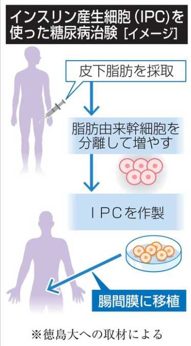 徳島大の池本教授らのチームは、脂肪から作られる多機能性幹細胞の一種「脂肪由来幹細胞」に注目。患者の脚の付け根から皮下脂肪1グラムを採取、脂肪由来幹細胞を分離して増やし、インスリン産生細胞(IPC)を作製した。