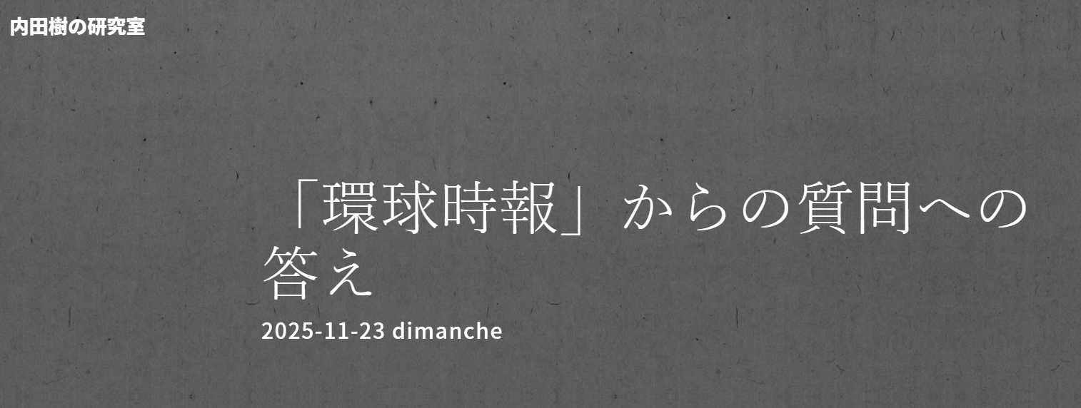 「グローバル資本主義の終焉、少子高齢化による過疎化と限界集落化という現実を踏まえて、『地方移住・帰農・山河の回復』というオルタナティブについて提言をしております。」という内田樹氏が、中国共産党の機関紙『環球時報』から高市発言について求められたコメントに対する返答です。原文はかなりの長文です。以下は、誤解を招くかもしれませんが、『環球時報』からの質問は全文を紹介し、内田氏の答えは抜粋しています。正しく理解するためには全文をお読みください。