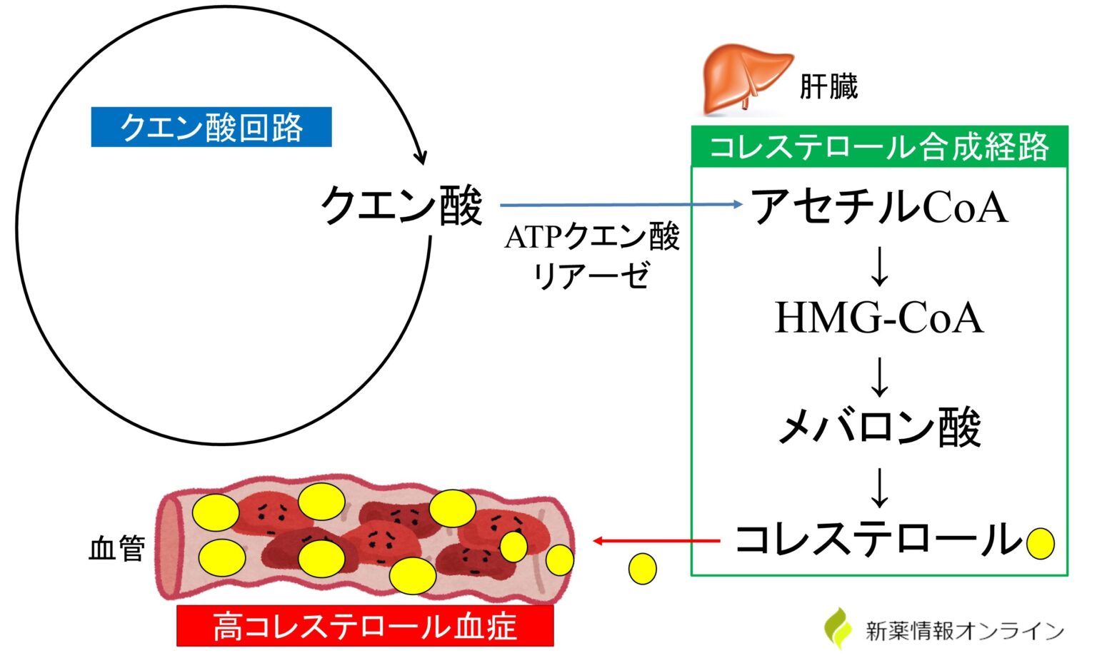 本剤は、肝臓中のコレステロール合成経路においてスタチンの作用点よりも上流にあるATPクエン酸リアーゼに作用し、血中のLDLコレステロールの低下をもたらす。すでに米国や欧州をはじめ、世界の複数国・地域で高コレステロール血症治療薬として販売されている。