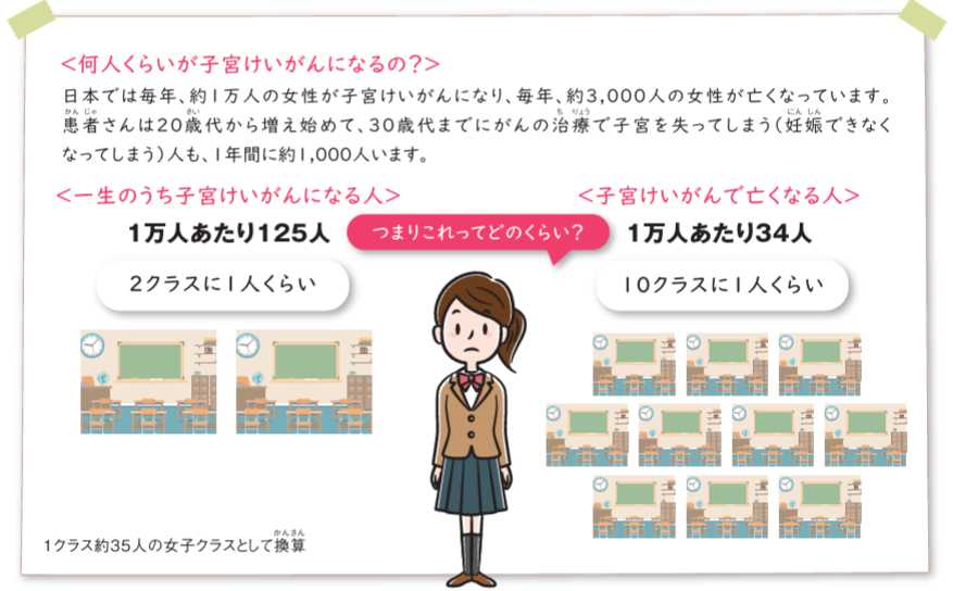 一般の方向け基本情報 よくあるご質問 HPVワクチンに関する相談先一覧」というサイトに書かれているように、ヒトパピローマウイルス(HPV)は、性的接触のある女性であれば50%以上が生涯で一度は感染するとされている一般的なウイルスです。子宮頸がんをはじめ、肛門がん、膣がんなどのがんや、尖圭コンジローマ等、多くの病気の発生に関わっています。特に、近年若い女性の子宮頸がん罹患が増えています。