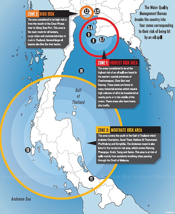 地図はタイ領海内の油流出リスク区域を示している(ゾーン1は極めて高いリスク、ゾーン2は高いリスク、ゾーン3は中程度のリスク)