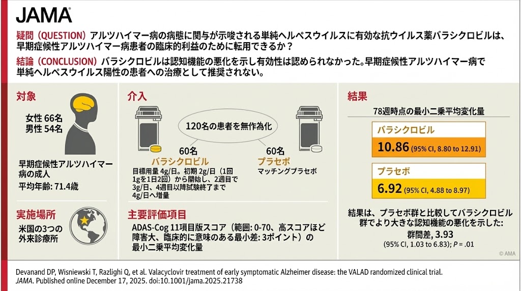 元論文のタイトルは、”Valacyclovir Treatment of Early Symptomatic Alzheimer Disease: The VALAD Randomized Clinical Trial(初期症状のアルツハイマー病に対するバラシクロビルの治療:VALAD ランダム化臨床試験)”です(論文をみる)。