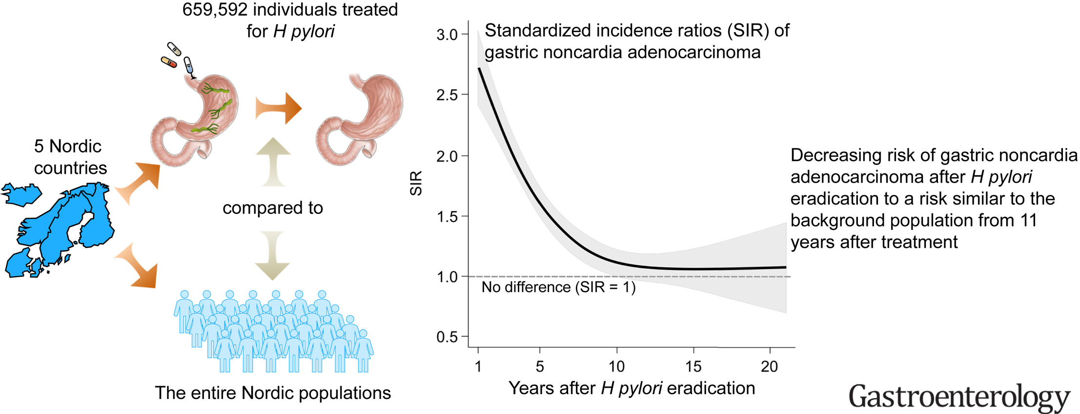 1995年から2019年の間に北欧諸国(デンマーク、フィンランド、アイスランド、ノルウェー、スウェーデン)のいずれかでH. pylori除菌治療を受けたすべての成人が含まれた。胃非噴門部腺癌の発生率を、同年齢・性別・暦年・国の背景集団の発生率と比較した。