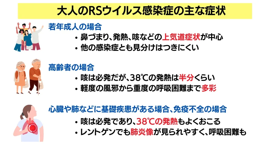 これでは、「子供の病気で大人は関係ない」印象を受けてしまいます。しかし、よくみると、「主な症状」のところの最後に「一般的には、風邪の様な症状のみで重症となることは少ないとされていますが、慢性呼吸器疾患等の基礎疾患のある高齢者や免疫不全者では、重症化するリスクがあることが知られており、注意が必要です。」と書かれています。