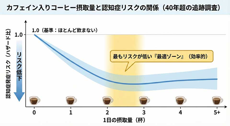 また、ここで注目したいのは、カフェインを除去した「デカフェ」のコーヒーでは、こうした明確なリスク低下との関連が認められなかった点です。このことから、脳を守る立役者の一人はやはりカフェインであると推察されています。