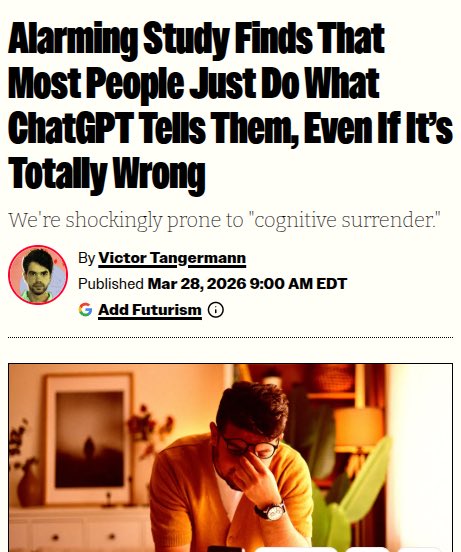 AIの誤情報を疑うこと無くそのまま受け入れる「認知的降伏」という状態に多数の人が陥っていることが明らかに、1372名の参加者と9000回以上の実験で