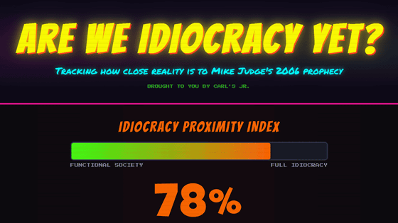 そのようなミームに基づいて、「26世紀青年」の愚かすぎる設定やストーリーと現実世界がどれくらい近づいてしまっているのかを追跡しているサイトが「IDIOCRACY PROXIMITY INDEX(愚民政治近接度指数)」です。サイトによると、記事作成時点の愚民政治近接度指数は「78%」とかなり高くなっています。