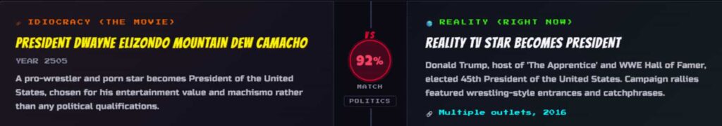 IDIOCRACY PROXIMITY INDEXでは、各設定ごとに現実との一致度も示されています。例えば、作中でアメリカ合衆国大統領を務める人物は元プロレスラーのポルノ俳優で、政治力や賢さではなくエンターテインメント性だけで選出されています。トランプ大統領も2013年にアメリカのプロレス団体・WWEのWWE殿堂に選出されており、選挙集会ではプロレス風の入場演出やキャッチフレーズが用いられたほか、リアリティ番組の司会者を務めた過去も合わせてエンターテインメント性が高い経歴になっています。結果としてIDIOCRACY PROXIMITY INDEXでは、「大統領の選出」という項目において映画と現実の一致度が「92%」と算出されています。